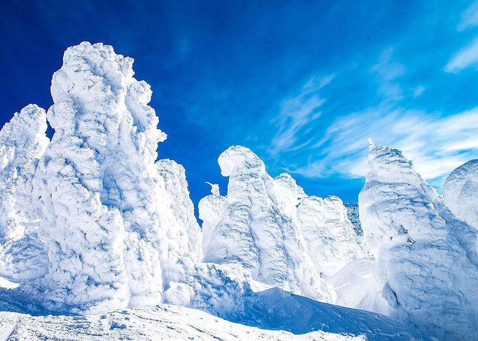 冬になると、木に氷と雪が付いて巨大な形にな樹氷(スノーモンスター)が見られます。